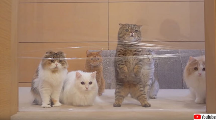 ドアを開けた部分に透明ラップ的なものを貼り、見えない壁を作る。その向こうにいる猫たちの反応を見る「見えない壁シリーズ」は人気のコンテンツとなっているが、今回挑戦するのはこの7匹。