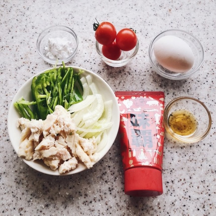 ・玉ねぎ、ピーマン、サラダチキン、ミニトマトを入れ30秒ほど煮る。