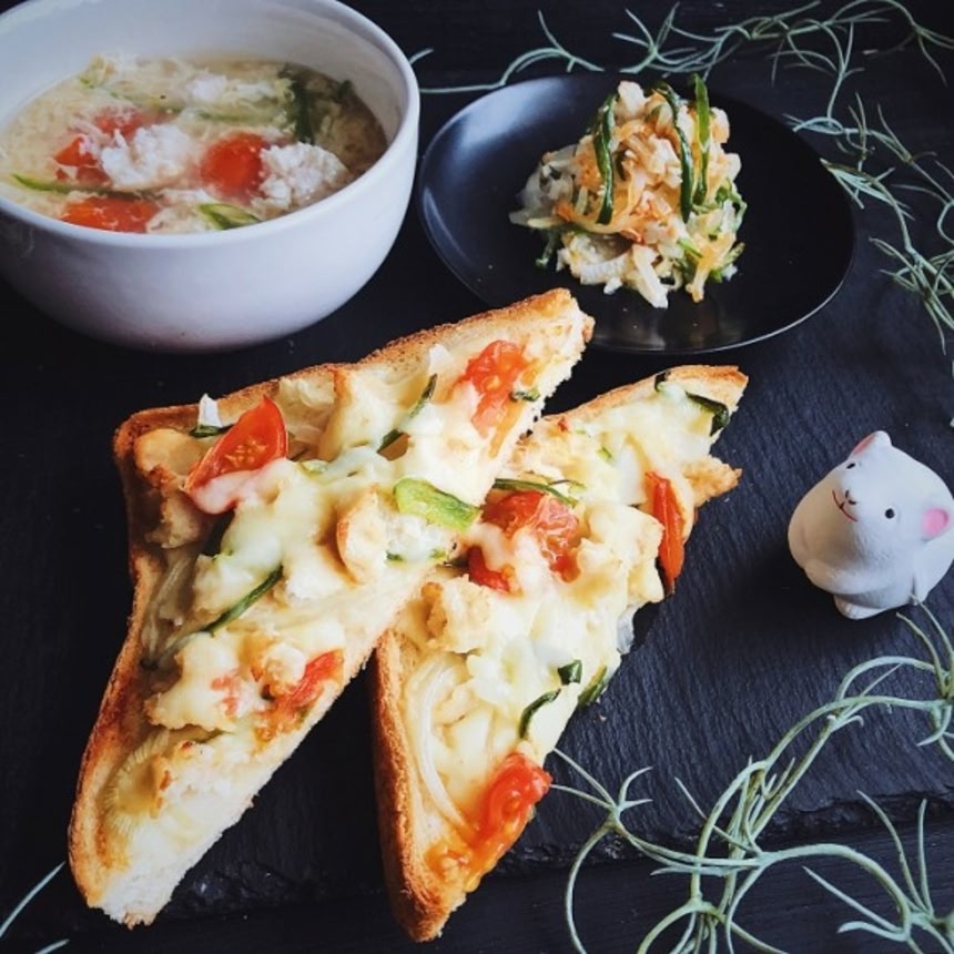 この画像を大きなサイズで見る一般的なピザトーストより軽めでチーズのコクがアクセントのクセになるおいしさ。コンビニのチキンをちぎって手軽に作れるヘルシーな一品。