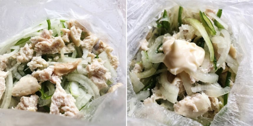 この画像を大きなサイズで見る・ビニール袋に玉ねぎ、ピーマン、サラダチキン、ウェイパーを入れる。