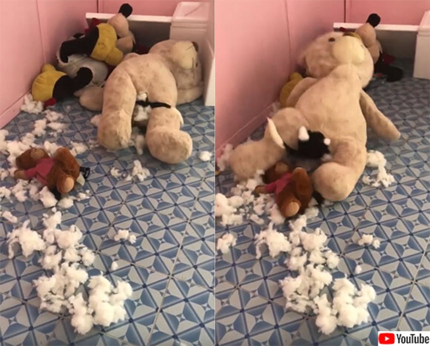 テディベアの腹部に入り込み、一心不乱に内臓(中綿)をえぐりとろうとしている犯人の正体は…ビーグルの子犬だった!