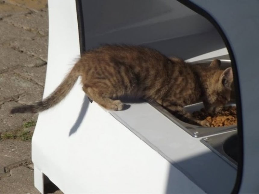 使用済みのペットボトルをリサイクルマシーンの中に落とすと、野良犬や野良猫、地域の鳥のために餌や水が出てくる仕組みになっている。