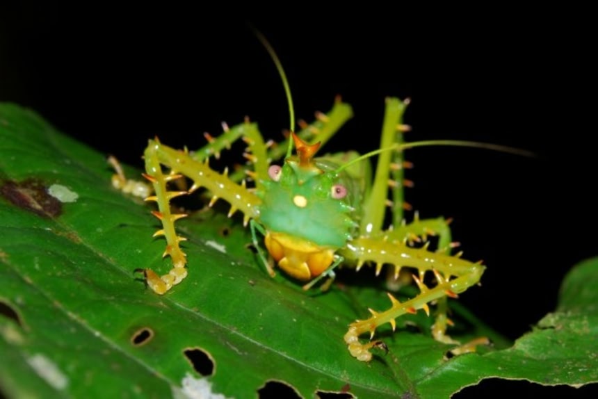 南米熱帯雨林に生息し「悪魔のキリギリス」の異名を持つ。この動画の個体はエクアドルに生息するメスで全長は8cmほど。