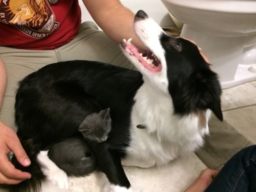 弱った子猫を拾う→連れて帰る→元からいた犬が子猫を可愛がってくれる