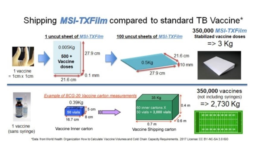この画像を大きなサイズで見るそれまでのびん入りワクチンに比べ、新型フィルムはかさばらないので、輸送にも有利。従来、35万回分のワクチンは、注射器を除いても2730キロの重量があったが、新型フィルムならたったの3キロでしかない