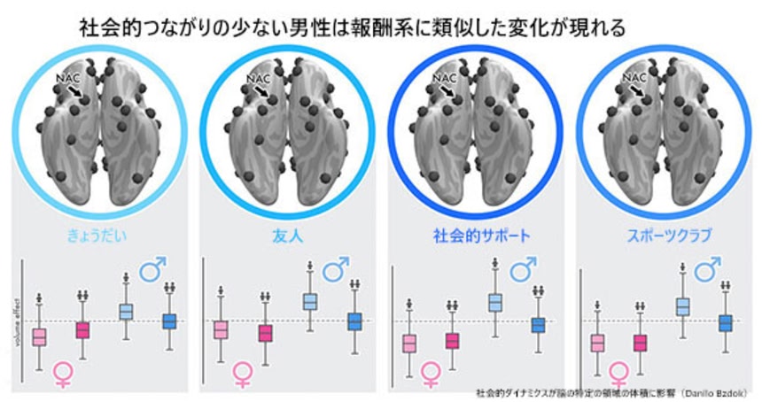 また社会性に乏しい生活を送る男性の場合、側坐核(NAC)のような報酬と関連する社会脳にも似たような影響があった。