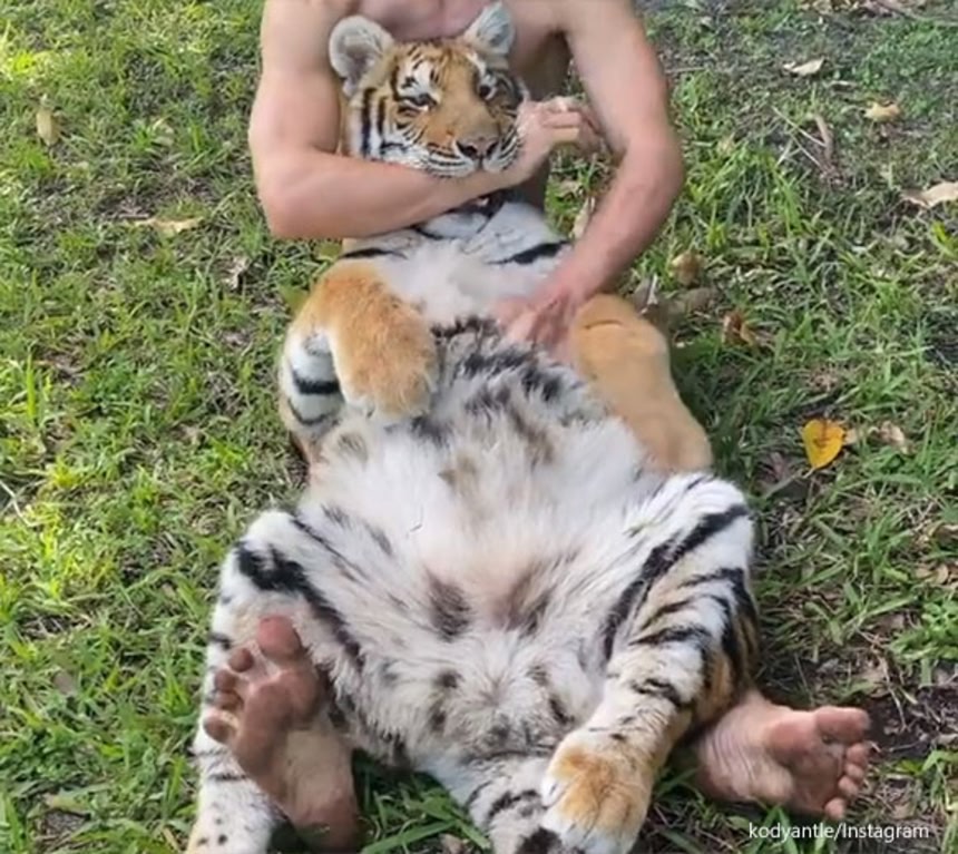 ということで、アメリカ・サウスカロライナ州にある大規模な野生生物保護施設「マートル・ビーチ・サファリ」では、スタッフのコーディー・アントルさんと深い絆を結んだメスの虎、アンバが彼の膝に体を預けながら、お腹をモフモフされている最中だ。