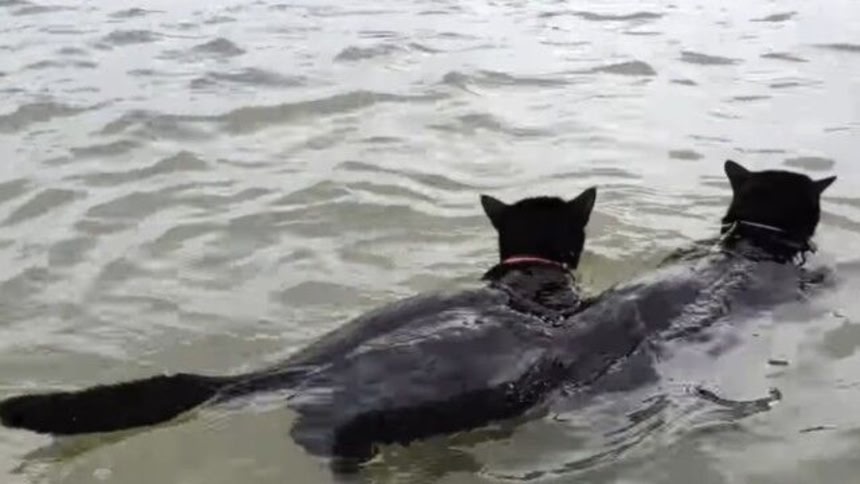 元保護猫のネイサンさんとウィニーさんは、オーストラリアのクィーンズランド州にお住いの黒猫さんだ。海好きな飼い主さん夫妻のもと、2匹はいつの間にかスイマーキャットになっていったそうだ。