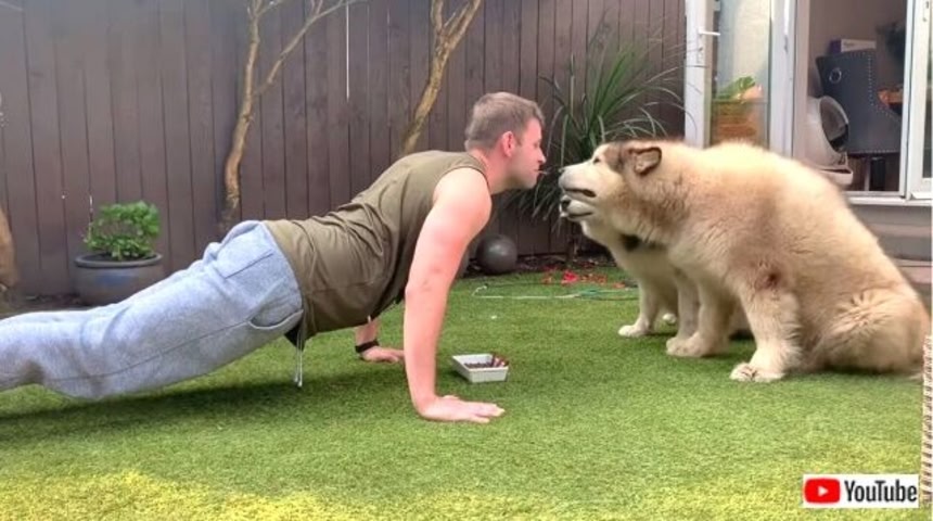 この画像を大きなサイズで見る2匹にお手伝いをしてもらいながらの腕立て伏せに……。