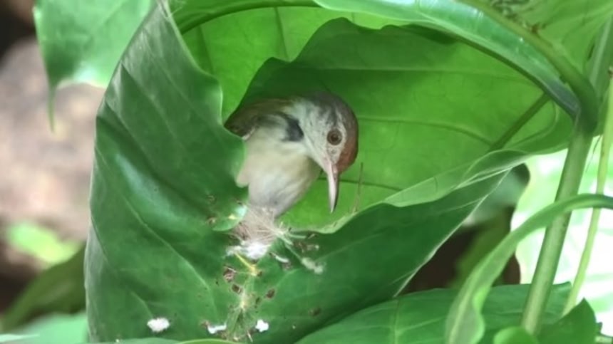 1枚もしくは2枚の堅い木の葉を縫い合わせ、捕食者から身を守るためのカモフラージュ用として、また快適な避難場所として巣を作成する。
