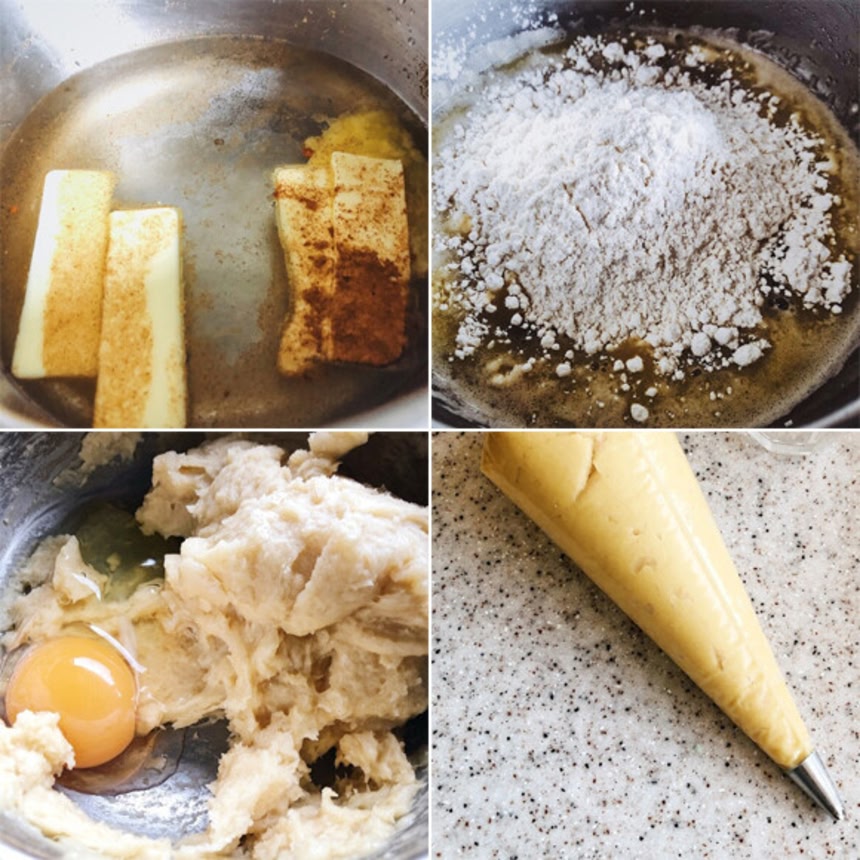 この画像を大きなサイズで見る・鍋に水、バター、塩、シナモンを加え中火で混ぜる。