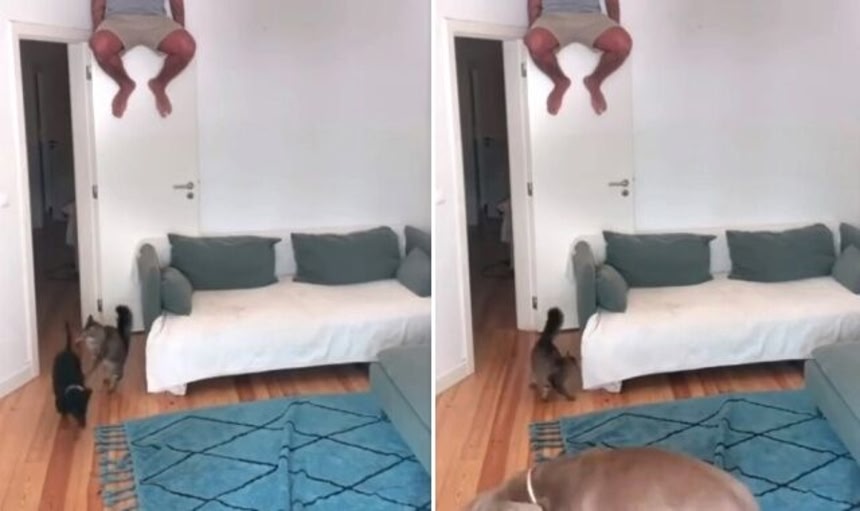 自粛生活で少々ストレスが溜まってしまった飼い主さん。ある日忍者ゲームを思いついて、ドアの上に乗っかって、ペットたちを呼ぶよ。