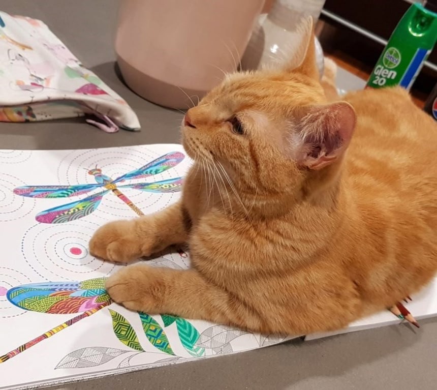 この画像を大きなサイズで見る3. 色鉛筆を噛むのを止めるようにお願いしたら、塗り絵の上に鎮座して動かなくなった猫。ねこがどくまで作業は中止