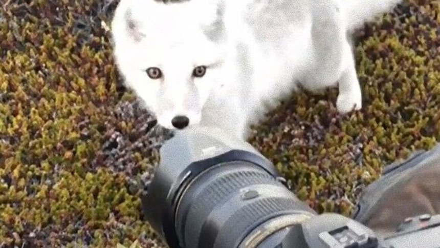 初めて見るカメラと人間に興味津々なホッキョクギツネ