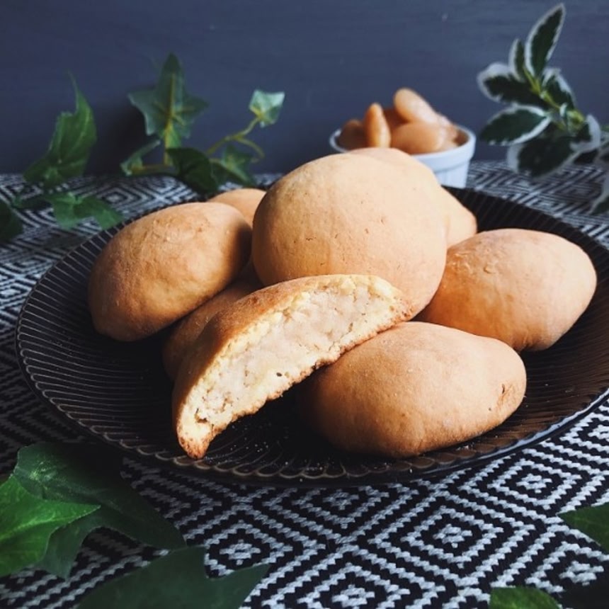 白餡(あん)に練乳を加えミルキーに仕上げ、バターを入れた生地で包み込む。白餡は市販のパックで売られている白花豆を濾すだけなので簡単にできちゃうよ。生地には重曹を入れるのでふっくらプックリとした食感を楽しめる。