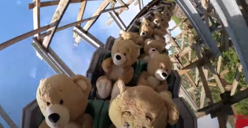 22体の大きなテディベアで席が埋まったジェットコースターが走っている様子は、シュールでありながらも思わずニヤリとしてしまう。