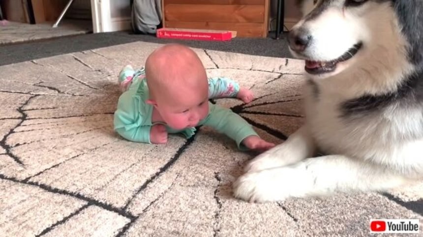 この画像を大きなサイズで見るこれはアレだね、ミアちゃんもうハイハイ秒読み状態じゃない? もしかしたら次の動画では、ハイハイしながらマラミュートたちを追いかけるミアちゃんの姿が見られるかも?