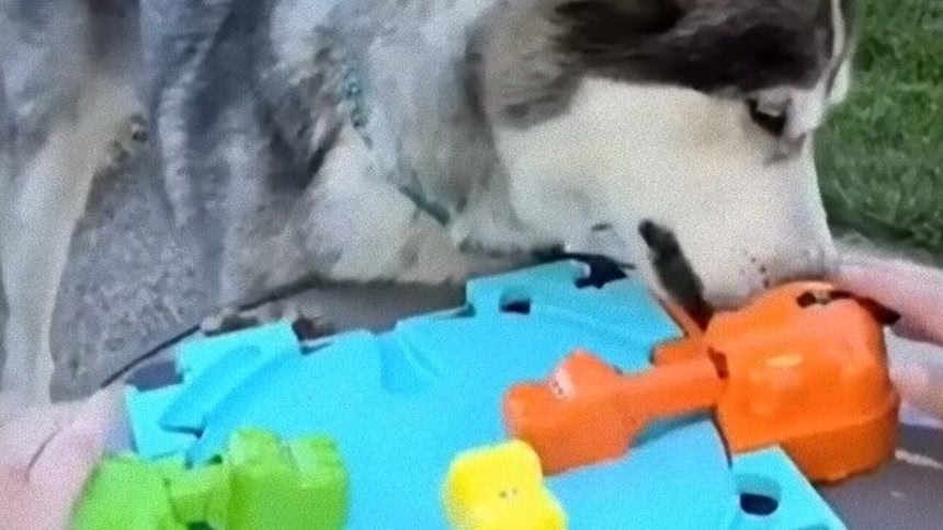 ご飯の準備に入ったハスキー、ご飯をカバのついたおもちゃの中に入れられる。そんでもってヨーいドン!すると、方々から人間の手が現れてカバのボタンをタップしまくると、カバがばくばくドッグフードを食べていく。こうして一気食いが無事に防がれた…けれどもハスキーは見逃さなかった。カバのおもちゃの穴に自分のご飯がたまっていたことを。しっかりちゃっかりそこからも食べていたよ。