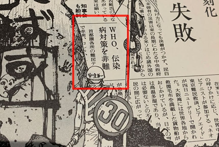 それだけではない。漫画版の3巻の巻末には、新聞形式にデザインされた次巻の予告が掲載されているのだが、そこには「WHO、伝染病対策を非難」との一文がある。