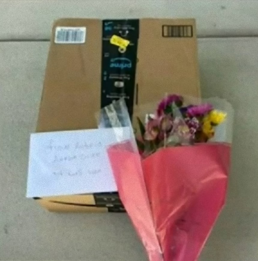 その配達員は、男性宅に荷物を届けた時に事情を知り、わざわざ花とメッセージを書いたカードを玄関先に置いてくれたという。
