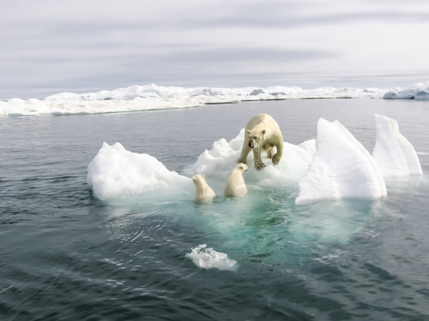 この画像を大きなサイズで見る科学者らの研究によると、今から100年未満に北極圏内からは氷が消え、ホッキョクグマは絶滅する可能性が高いと予想されている。