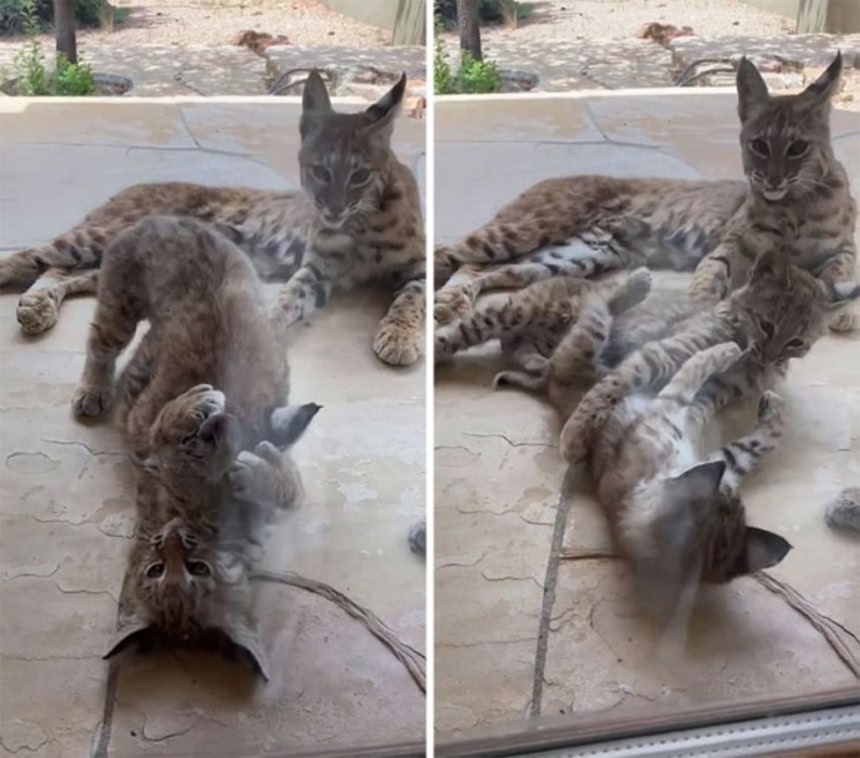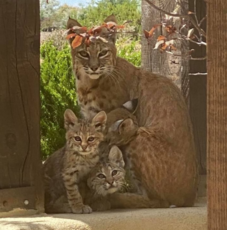 先月8日、ニューメキシコ州に住むアーティストのキャシーさんが自宅の玄関前でのんびりくつろぐボブキャットファミリーを発見!