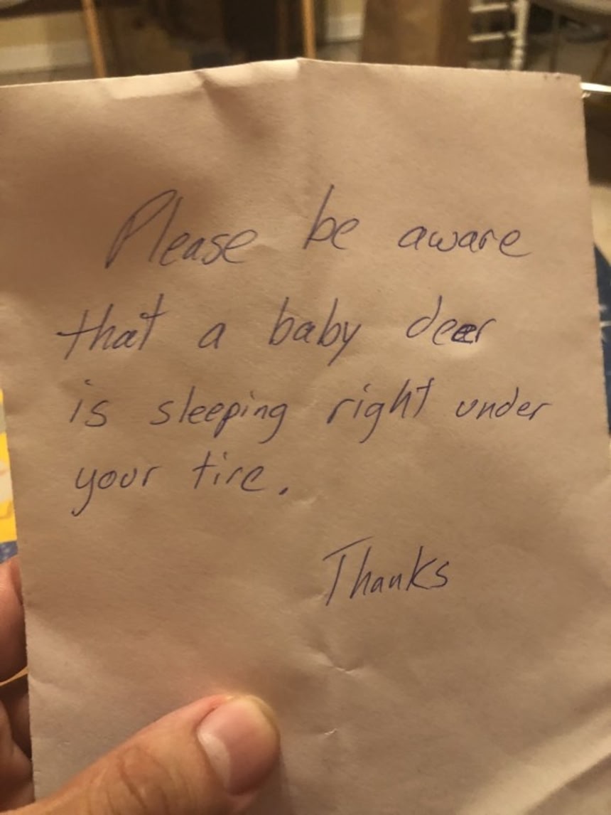 1.両親の家の隣に住む素敵な高齢女性が玄関先に残したメモ。そこには「お宅の車のタイヤの傍に鹿の赤ちゃんが眠っているので気を付けてあげてね」と書かれてあった。