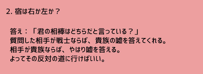 2問目は、「あなたに宿の方向を尋ねたら、どちらの方向を示しますか?」って聞くといいよ。そうすると、戦士でも貴族でも正しい方向を示してくれる。仮に戦士か貴族の一方しかいなかった場合でも宿の方向がわかる優秀な聞き方よ。