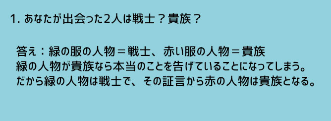 この画像を大きなサイズで見る異世界に転生したあなたは旅をしている。その世界には戦士と貴族の2種類の人たちがいる。戦士はいつも本当のことしか言わない。だが貴族は嘘しかつかない。