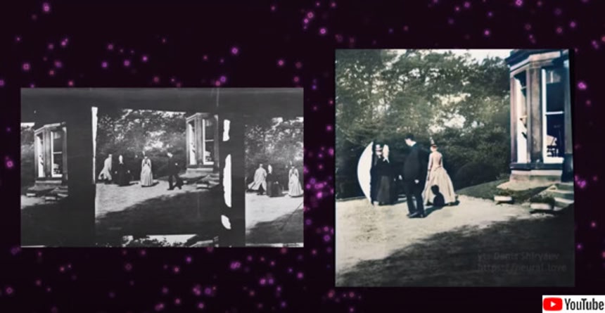 映像はフランスの発明家ルイ・ル・プランスがおよそ130年前に撮影した「ラウンドヘイの庭の場面」のコマをニューラルネットワークで補いカラー化し、より見やすくしたもの。