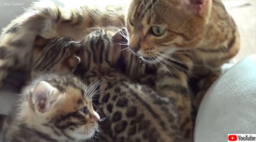 子猫たちがいるベッドに入り、グルーミングしたりお乳を与えたりしているが、子猫が鳴くとその声に気が付き鳴き声を返す。