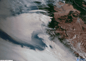 コロラド州立大学の大気科学共同研究所(CIRA)が新たに提供した人工衛星からの映像には、アメリカ西海岸で発生した森林火災の様子がはっきり映し出され、ワシントン州、オレゴン州、カリフォルニア州にまで広範囲に広がっていることがよくわかる。