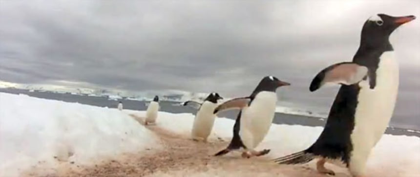 オーストラリアの南極探検隊からかわいらしい映像が届いた。部隊が移動している途中、1匹のコウテイペンギンが彼らの後を追いかけてきたのだ。