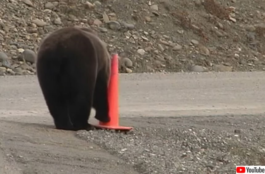 アラスカにあるデナリ国立公園でのできごとだそうだ。道路を歩いていた1頭のクマが倒れたロードコーンこを発見。