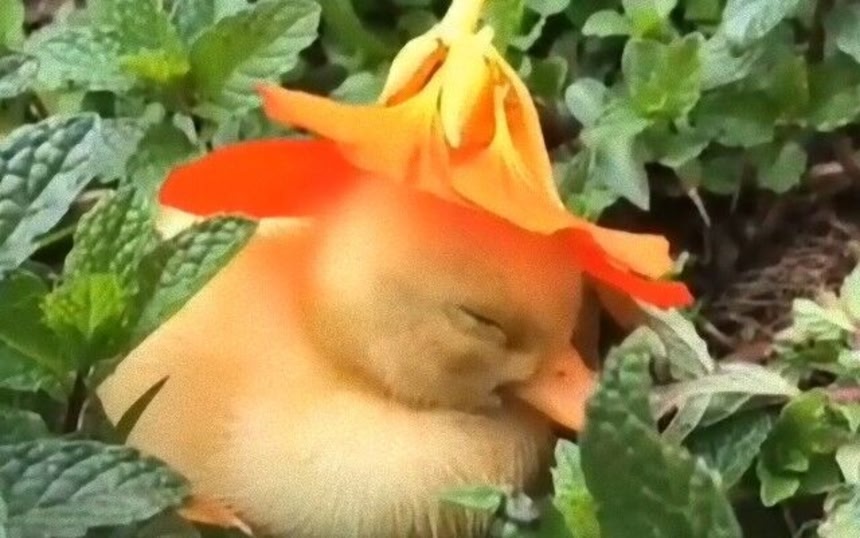 心身ともにほっこりのんびりできる動画とそれに関する海外の反応が発見されたよ。鳥のヒナにお花を帽子のようにかぶせたところ、うとうとし始めた。