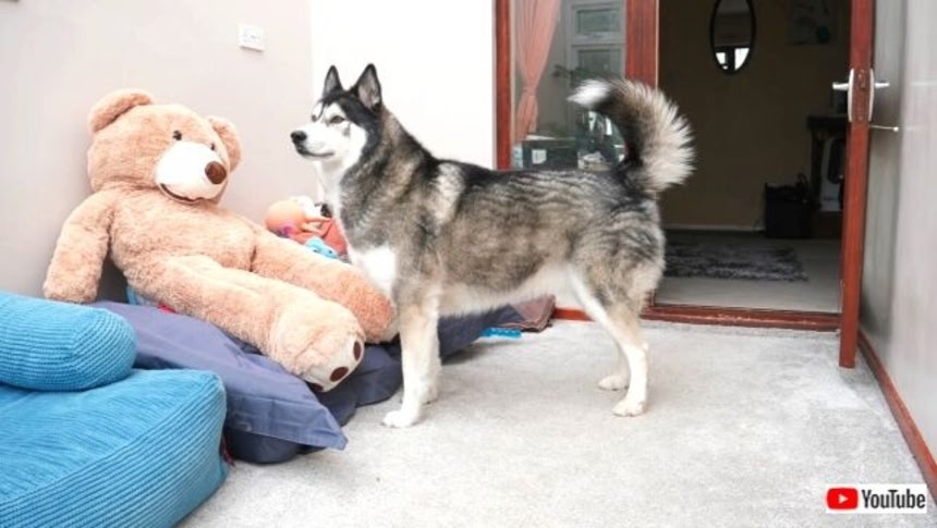 ご主人の声が流れるようにセットしたスマホが仕込まれた、この巨大なぬいぐるみ。キーシュくんはご主人に呼ばれた!と思って飛んで来たけど、あれれ? 誰もいないよ?