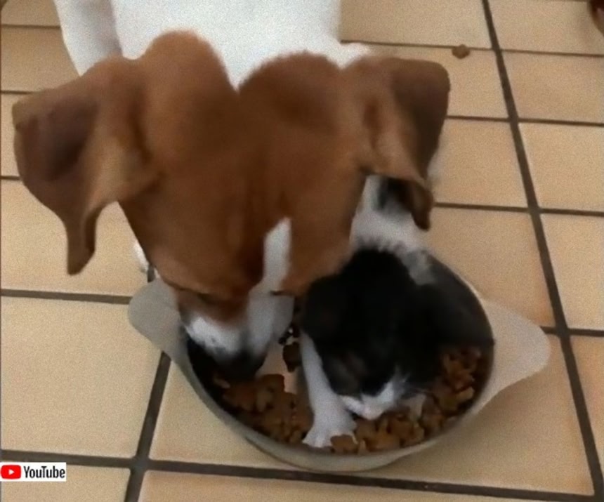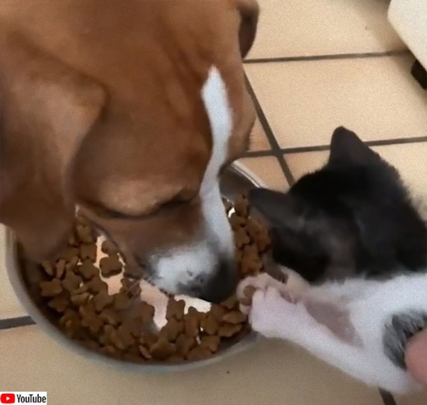 犬の餌が入った皿に入り込み、餌を全てキープしようとしているのは小さな子猫。犬は餌が食べられなくてちょっと困り気味。