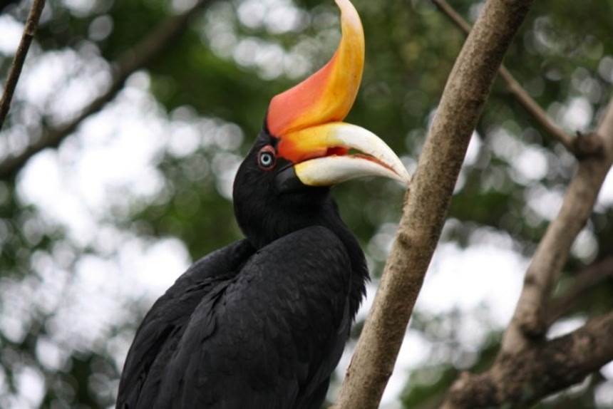この画像を大きなサイズで見る東南アジアの熱帯雨林の山に生息している。実際のクチバシの上に、赤とオレンジ色をしたクチバシもどぎがついている。これは角で、この角のおかげで鳴き声が増幅されて森中に響き、叫び声のように聞こえるという。