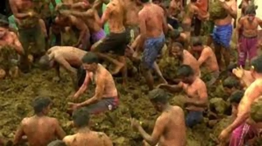 マリーゴールドの花で飾られた牛が引くトラクターに積まれた肥料は、地元の寺院へと運ばれ、僧侶が祝福の儀式を執り行う。その後、大量の牛糞は村の空地へと運ばれ、村人らはほとんど裸になって戦いを始める。