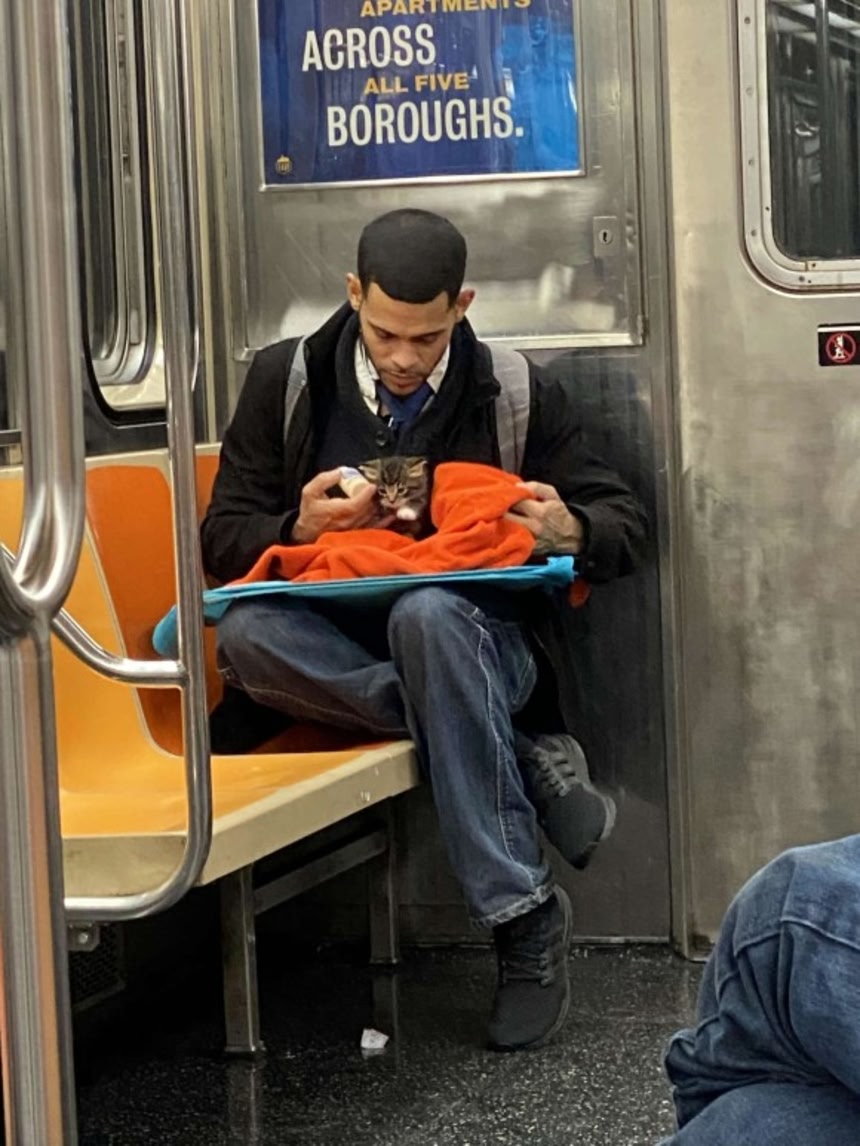 アメリカ、ニューヨークの地下鉄車内で、ある男性がとても小さな子猫に哺乳瓶でミルクを与えていた。