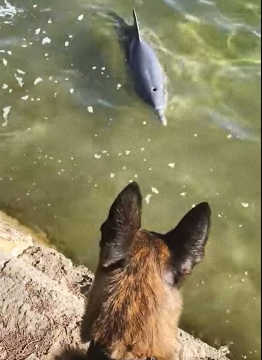 川で泳ぐ2頭のイルカと警察犬との間に、どうやら友情が芽生えたらしく、互いが好奇心を旺盛に示す姿はとても微笑ましい。