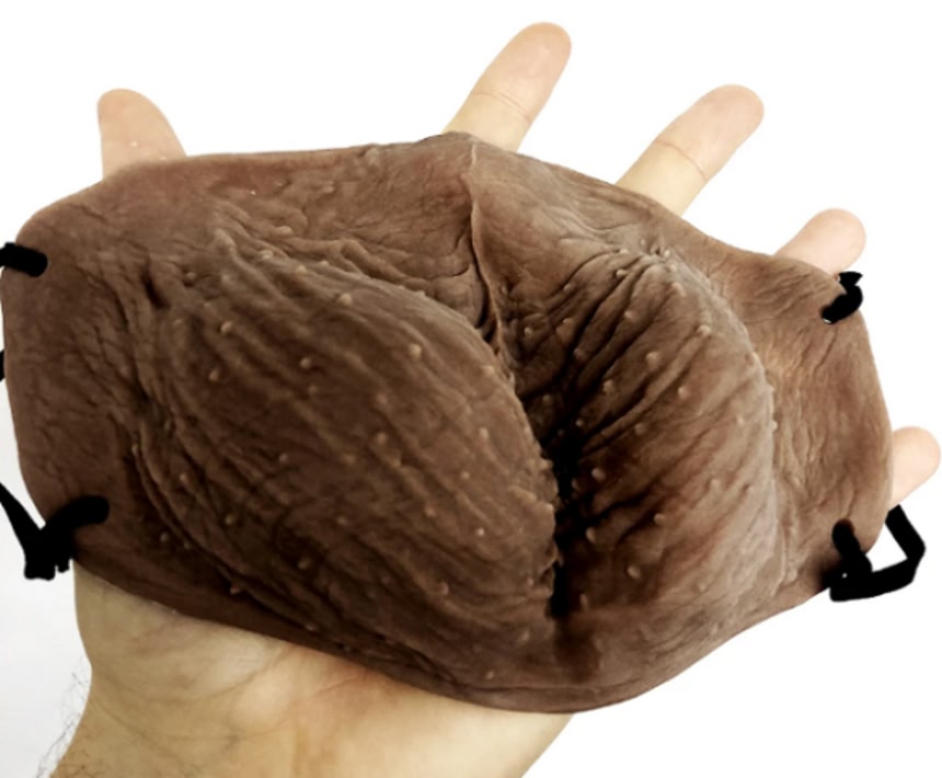 いったいどこに需要があったのかはわからないが、実際に通販サイトで販売されているこの「ボールバッグマスク(BallBag mask)は、ふぐりの形状をそのまま再現したフェイスマスクなのである。