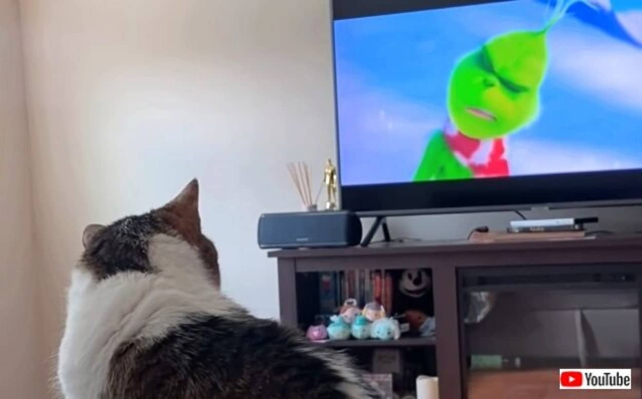 猫のエラさんの趣味は映画鑑賞だ。食い入るように画面を見つめるこの瞳。エラさんのお気に入りは、アニメの「グリンチ」だ。