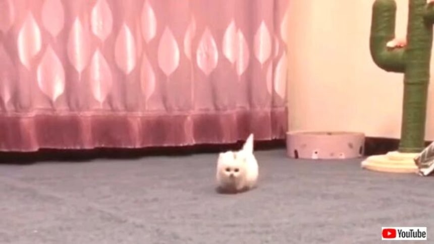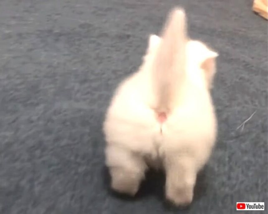 部屋の向こうから走ってくる、白いふわモコ毛玉ちゃん。
