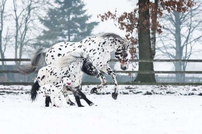 その中でも、アパルーサ・スタリオンの馬ネバダ(10歳)とシェトランド・ポニーのナポレオン(6歳)は、一家の飼い犬ダルメシアンのジャック・スパロウ(2歳)と同じ黒い斑点を持ち、この3頭はとても仲良しなのだそうだ。