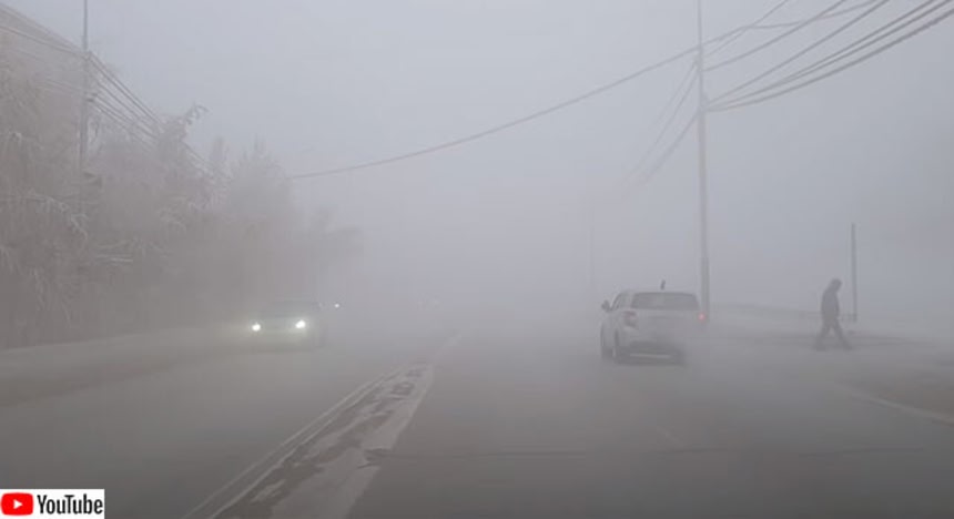 1月の平均気温は-40.9℃で厳寒期には最低気温が-50℃以下になることもある。2021年1月4日、この日の外気温は-49℃だったそうで、車載カメラがその時の道路の様子を撮影していた。