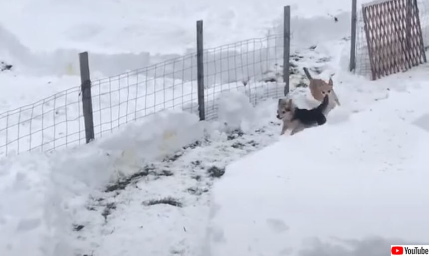 アメリカ、ペンシルベニア州レイクアリエルでは、昨年12月20日に雪が積もった。そこでカレン・フィオレッティさんは、飼い犬たちの為に庭に積もった雪の一部を雪かきし、クネクネと曲がるレース場を作り上げた。