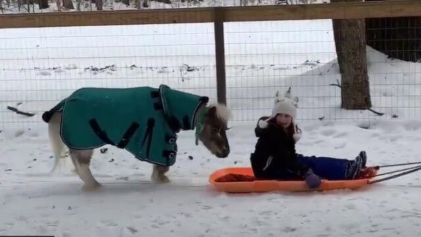 アメリカ合衆国のミシガン州にて、ソリに乗って雪景色を楽しむお子さんをミニチュアホースが追いかける動画が撮影されていた。