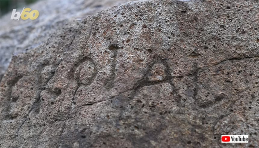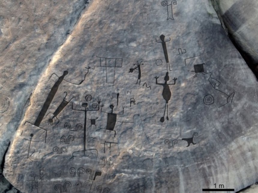 最近発見されたこの岩絵には、スイギュウ、キリン、家畜など動物のほかに、エイリアンのようなもの、角を生やした人型の物体、人間を食らっているものも描かれている。
