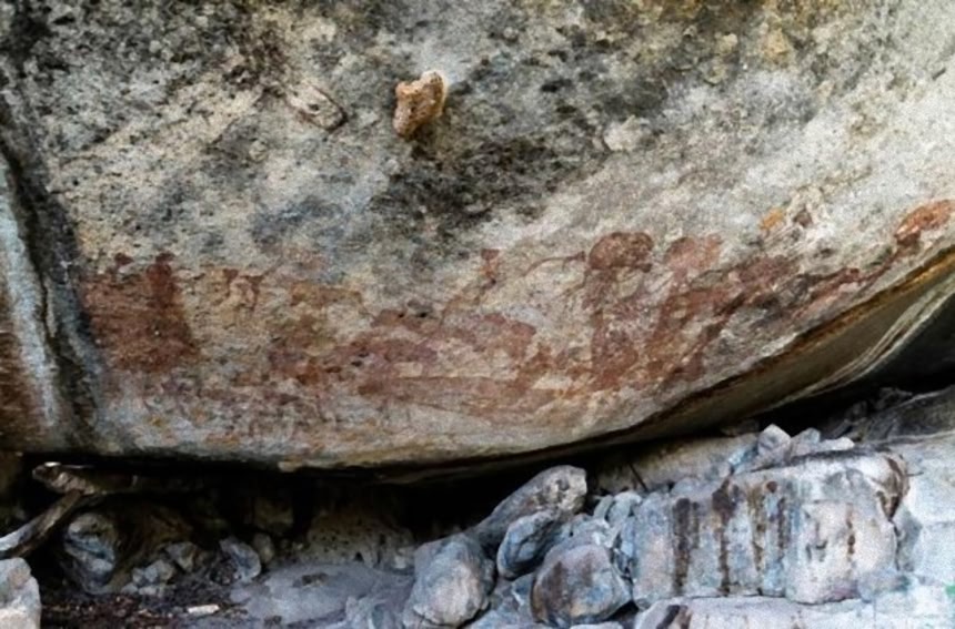 この岩絵は、岩がせり出している下に描かれていたせいか、長年の太陽光や流水などから守られ、色素が色褪せないで済んだようだ。